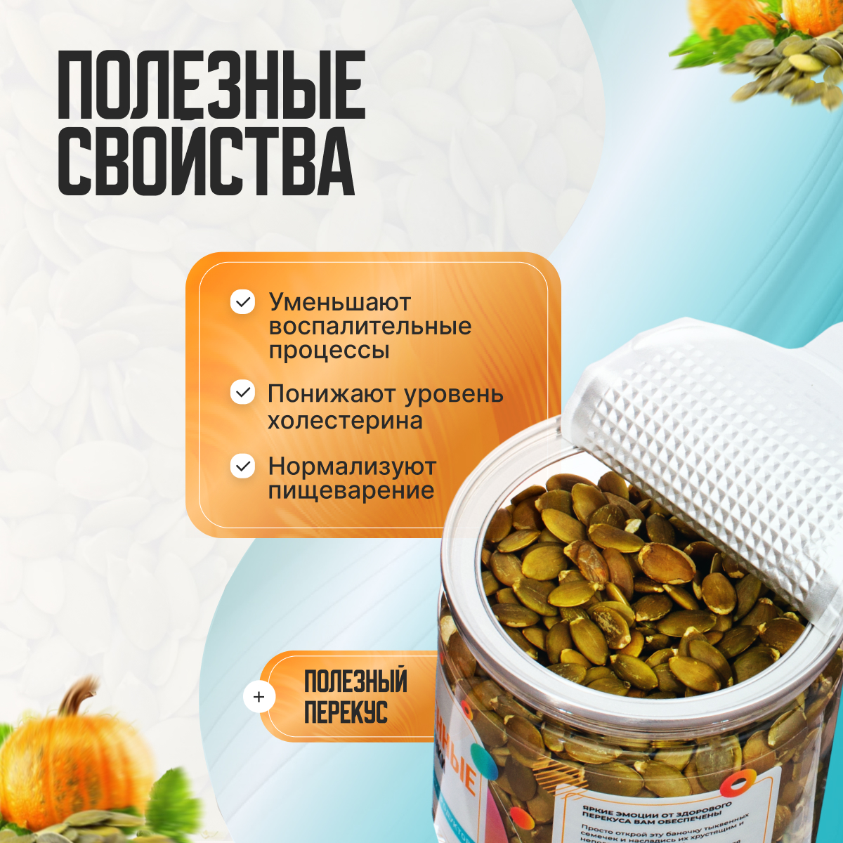 Тыквенные семечки содержат массу питательных веществ, полезных для многих аспектов вашего здоровья. Семечки богаты белком, клетчаткой, полезными жирными кислотами, включая омега-3. В их состав входят магний, цинк, железо, медь, витамины группы В и антиоксиданты, которые защищают наши клетки от вреда, уменьшают воспаление в нашем организме.